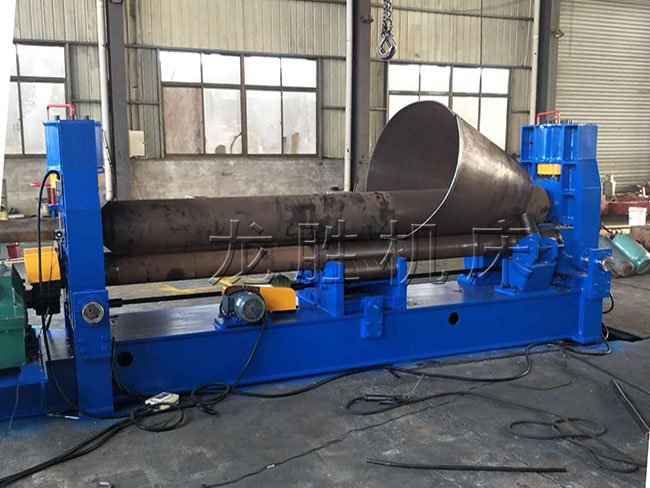 該機屬于液壓型三輥卷板機,用于常溫狀態下將各種容器用碳鋼、低合金鋼一次上料后不需調頭即完成板材端部預彎、卷圓和矯圓等工序。