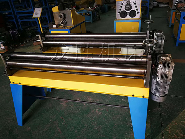 該機結構形式為三輥非對稱式上輥為主傳動下輥垂直升降運動,以便夾緊板材,并通過下輥齒輪與上輥齒輪嚙合,同時作為主傳動;邊輥作傾升降運動,具有預彎和卷圓雙重功能。結構緊湊,操作維修方便。