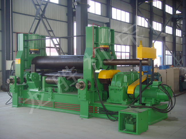 該機屬于液壓型三輥卷板機,用于常溫狀態(tài)下將各種容器用碳鋼、低合金鋼一次上料后不需調(diào)頭即完成板材端部預彎、卷圓和矯圓等工序。