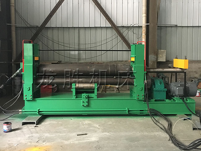 該機結構型式為三輥對稱式,上輥在兩下輥中央對稱位置作垂直升降運動,通過液壓缸內的液壓油作用于活塞而獲得,為液壓傳動,兩下輥作旋轉運動,通過減速機的輸出齒輪與下輥齒輪嚙合,為卷制板材提供扭矩。